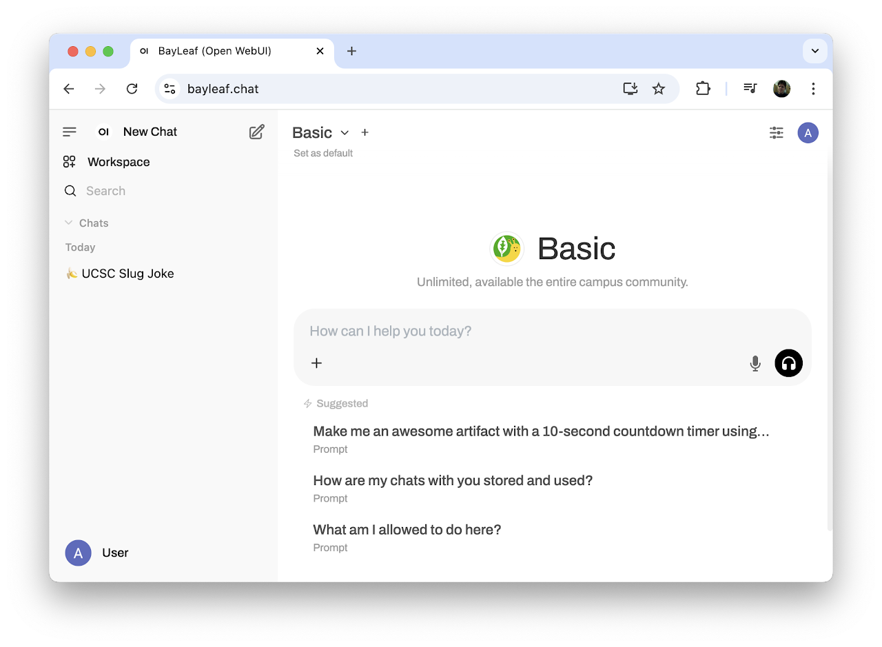 BayLeaf Chat and BayLeaf API form an experimental Generative AI Playground designed to serve the entire UC Santa Cruz campus community (students, faculty, and staff). The system is operated by Adam Smith (faculty from the Department of Computational Media), as a living prototype of a possible future university-managed service.